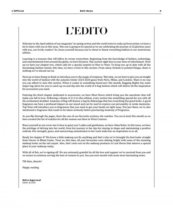 L'Officiel India is a fashion magazine published in India by TCG Media Limited. It is a part of the international L'Officiel magazine group, which has editions in over 30 countries. L'Officiel India was launched in 2006 and is published monthly. It covers fashion, beauty, lifestyle, and culture. The magazine features interviews with fashion designers, models, and celebrities, as well as editorials, features, and news. L'Officiel India is aimed at a sophisticated and discerning audience. It is known for its high-quality photography and editorial content. The magazine is a popular choice for fashion enthusiasts in India. Here are some of the features of L'Officiel India: * Fashion: L'Officiel India features the latest trends in fashion from India and around the world. It covers runway shows, designer collections, and street style. * Beauty: L'Officiel India covers the latest beauty trends and products. It features interviews with beauty experts, makeup tutorials, and skincare advice. * Lifestyle: L'Officiel India covers a variety of lifestyle topics, including travel, food, and culture. It features interviews with celebrities, travel guides, and recipes. * Culture: L'Officiel India covers the latest in art, music, and literature. It features interviews with artists, music reviews, and book excerpts. If you are interested in fashion, beauty, lifestyle, or culture, then L'Officiel India is a must-read. It is the best source of information on the latest trends and insights in these areas.