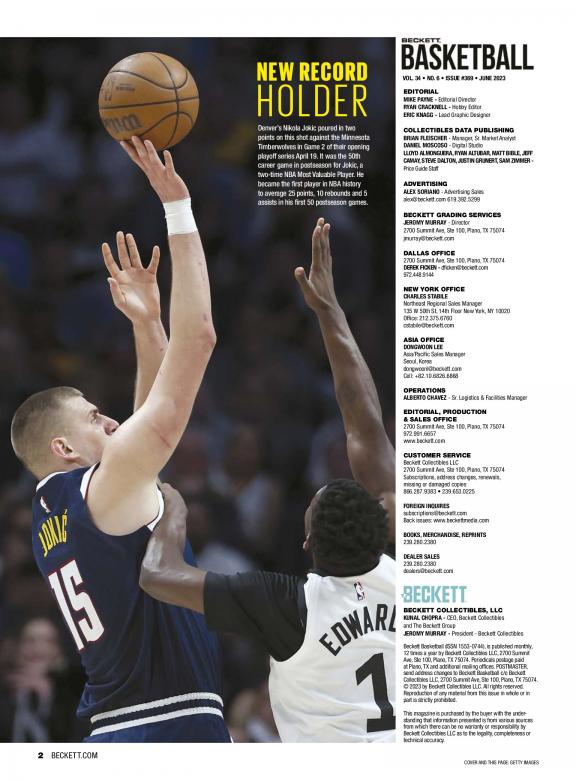 Step into the thrilling world of basketball collectibles and memorabilia with Beckett Basketball Magazine. We're excited to introduce you to this publication, your go-to source for all things related to basketball cards, collectibles, and the vibrant hobby of basketball memorabilia. Beckett Basketball Magazine, published by Beckett Collectibles LLC, is not just a magazine; it's your comprehensive guide to the world of basketball collectibles. As you explore the pages of Beckett Basketball Magazine, you'll find a world of content that caters to basketball collectors and fans alike: * Price Guides: Access up-to-date price guides for basketball cards, helping you stay informed about the value of your collectibles.