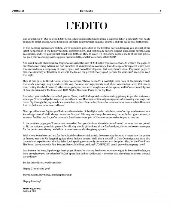 L'Officiel India is a fashion magazine published in India by TCG Media Limited. It is a part of the international L'Officiel magazine group, which has editions in over 30 countries. L'Officiel India was launched in 2006 and is published monthly. It covers fashion, beauty, lifestyle, and culture. The magazine features interviews with fashion designers, models, and celebrities, as well as editorials, features, and news. L'Officiel India is aimed at a sophisticated and discerning audience. It is known for its high-quality photography and editorial content. The magazine is a popular choice for fashion enthusiasts in India. Here are some of the features of L'Officiel India: * Fashion: L'Officiel India features the latest trends in fashion from India and around the world. It covers runway shows, designer collections, and street style. * Beauty: L'Officiel India covers the latest beauty trends and products. It features interviews with beauty experts, makeup tutorials, and skincare advice. * Lifestyle: L'Officiel India covers a variety of lifestyle topics, including travel, food, and culture. It features interviews with celebrities, travel guides, and recipes. * Culture: L'Officiel India covers the latest in art, music, and literature. It features interviews with artists, music reviews, and book excerpts. If you are interested in fashion, beauty, lifestyle, or culture, then L'Officiel India is a must-read. It is the best source of information on the latest trends and insights in these areas.