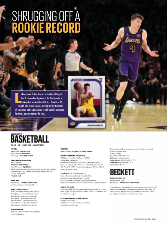 Step into the thrilling world of basketball collectibles and memorabilia with Beckett Basketball Magazine. We're excited to introduce you to this publication, your go-to source for all things related to basketball cards, collectibles, and the vibrant hobby of basketball memorabilia. Beckett Basketball Magazine, published by Beckett Collectibles LLC, is not just a magazine; it's your comprehensive guide to the world of basketball collectibles. As you explore the pages of Beckett Basketball Magazine, you'll find a world of content that caters to basketball collectors and fans alike: * Price Guides: Access up-to-date price guides for basketball cards, helping you stay informed about the value of your collectibles.
