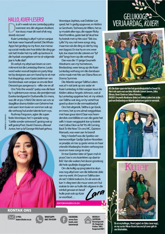 Kuier gee raad oor alles van ouerskap, geldsake, verhoudings en gesondheid tot mode, skoonheid, dekor en kos. Die tydskrif deel inspirerende stories oor mense in die gemeenskap en streef daarna om lesers op te hef en te bemagtig deur die klem te plaas op positiewe stories en suksesvolle rolmodelle. Die projekte is grootliks gemeenskapgebaseerd, met die visie om waarlik ’n verskil in lesers se lewens te maak.