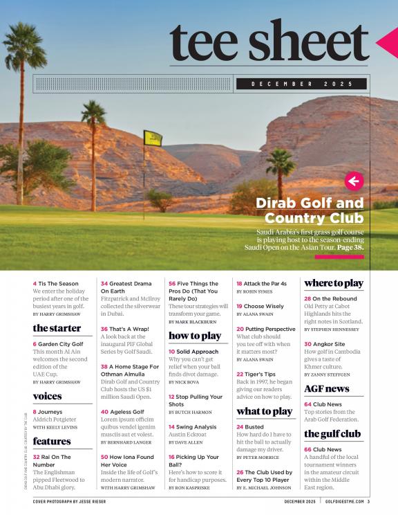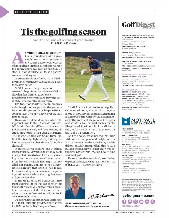 Golf Digest Middle East is the leading golf publication in the region and the biggest golf magazine brand globally. Featuring a blend of local and international content, Golf Digest Middle East is essential reading for the passionate golfer - combining expert tuition from the world's leading tour professionals with the latest in equipment, news and travel.
