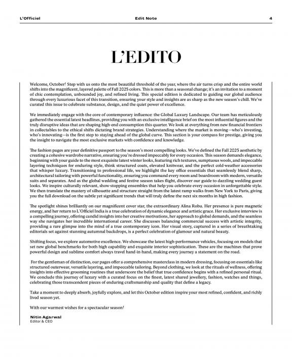 L'Officiel India is a fashion magazine published in India by TCG Media Limited. It is a part of the international L'Officiel magazine group, which has editions in over 30 countries. L'Officiel India was launched in 2006 and is published monthly. It covers fashion, beauty, lifestyle, and culture. The magazine features interviews with fashion designers, models, and celebrities, as well as editorials, features, and news. L'Officiel India is aimed at a sophisticated and discerning audience. It is known for its high-quality photography and editorial content. The magazine is a popular choice for fashion enthusiasts in India. Here are some of the features of L'Officiel India: * Fashion: L'Officiel India features the latest trends in fashion from India and around the world. It covers runway shows, designer collections, and street style. * Beauty: L'Officiel India covers the latest beauty trends and products. It features interviews with beauty experts, makeup tutorials, and skincare advice. * Lifestyle: L'Officiel India covers a variety of lifestyle topics, including travel, food, and culture. It features interviews with celebrities, travel guides, and recipes. * Culture: L'Officiel India covers the latest in art, music, and literature. It features interviews with artists, music reviews, and book excerpts. If you are interested in fashion, beauty, lifestyle, or culture, then L'Officiel India is a must-read. It is the best source of information on the latest trends and insights in these areas.
