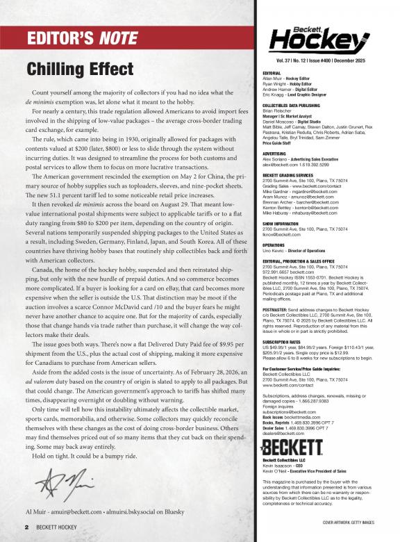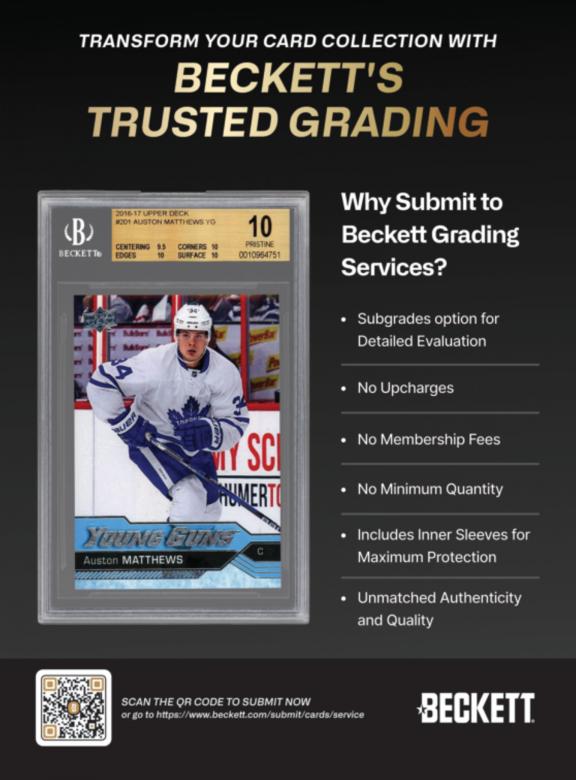 Beckett Hockey is a monthly magazine that features values on trading, including new releases. There are also articles on current trends, the latest releases and reviews of just-released products. Passionate readers use this magazine to find the worth of their cards, hot player and Rookie Cards to watch. Beckett Hockey is deal for longtime and novice collectors. Each issue has: • The Hockey Card Price Guide with more than 100 pages filled with values for past current releases. • The Hot List, a monthly guide with pricing and images for the top 20 hockey cards on the market • Articles with information on the latest trends and news in the hobby • Reviews of the latest hockey releases • Previews of upcoming products